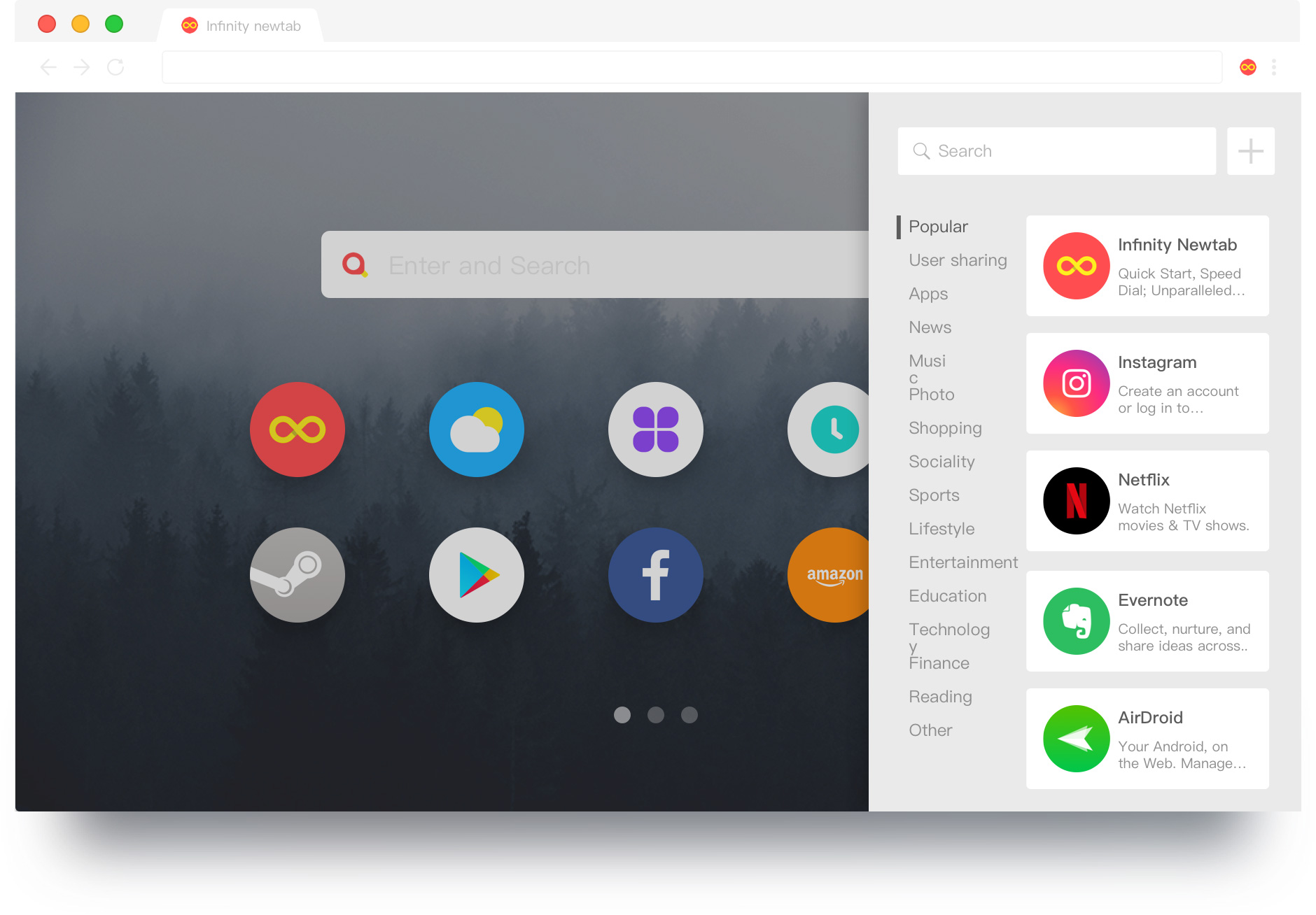 Infinity, based on the past knowledge of New Tab, redefines New Tab page today, to pursue minimalism aesthetic and one-stop service experience. As the new generation of tabs, it is a more usable and powerful New Tab.